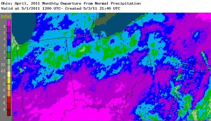 Residents of northern Ohio will remember the extraordinarily wet and gloomy spring of 2011 for many years. Ohio was located in a large area extending from the lower Midwest northeast up the Ohio valley that experienced record breaking precipitation and flooding during April and May. The images in the two panels below show the observed precipitation for April and May (left-hand side) and the departure from normal for each month (right-hand side). In April, the total precipitation across much of the lower Ohio valley was in the range of 15 to 20 inches, an amount that was nearly 600% of the long-term average. Many long-standing records fell during the period and rivers across the region and the lower portion of the Mississippi River reached historic levels.