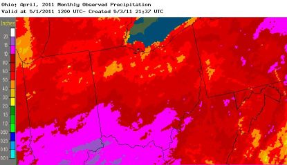 From January 1 through May 31, 2011 the total observed liquid precipitation at Cleveland-Hopkins Airport was 25.35”, a whopping 10.77” (73.9%) above normal. The precipitation during April and May was particularly heavy, with a new record of 6.89” being set in April; an amount more than twice the long-term average of 3.37". The previous record for April of 6.61" had persisted since 1961. As might be expected, there were wide variations in the April precipitation totals at other locations across northern Ohio. Akron-Canton, the farthest south of the cities examined received only 4.94", an amount only 1.55" above normal. The observations for Toledo, Ohio and Erie, Pennsylvania were similar to Cleveland at 6.33" and 6.38" respectively. The totals at Toledo and Erie were above normal, but well below their records.