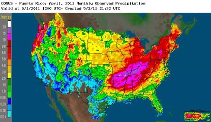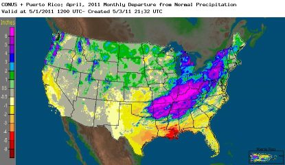 Upper left: Observed precipitation for April, 2011 (larger image). Upper right: Departure from normal precipitation for April 2011 (larger image). Imagery courtesy of NOAA. |