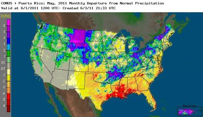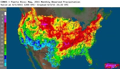 Upper left: Observed precipitation for May, 2011 (larger image). Upper right: Departure from normal precipitation for May 2011 (larger image). Imagery courtesy of NOAA. |