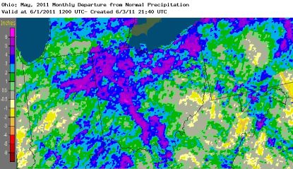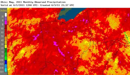 The record for precipitation at Cleveland-Hopkins for May is 9.14" which was set in 1989. While the total for May 2011 (7.74") did not exceed this amount, it was nearly 4.25" higher than the long-term average of 3.5". This places it second on the list of wettest Mays. Similar to April, the precipitation across northern Ohio was uneven with Akron-Canton recording 7.25" and Toledo and Erie accumulating 5.88" and 8.54" respectively. The total precipitation at Erie was 5.2" above their May average of 3.34".