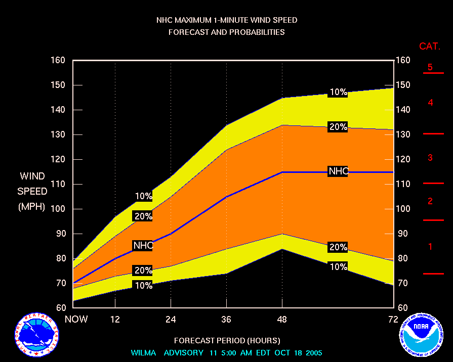 As they sat sipping their morning coffee on Tuesday, October 18, 2005, the residents of Florida's Gulf Coast must have been more than a little dismayed to find themselves once again located within a National Hurricane Center (NHC) 5-day cone. The 5-day advisory cone and its accompanying Wind Speed Forecast issued at 5:00am on October 18, 2005 predicted that Wilma, now a tropical storm located in the southwestern Caribbean, would transition to a Category 3 hurricane and make landfall on Saturday evening.