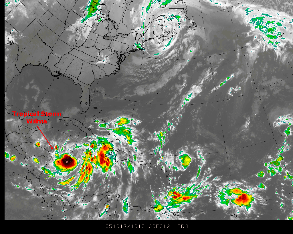 The depression drifted erratically over the next two days while slowly gaining strength. At 5am on the 17th, the system's sustained winds were now 35 knots (40mph), the barometric pressure was 1000mb and it was declared a tropical storm by the NHC. The infrared satellite image (below) from the morning of October 17th shows Wilma's location and overall structure.