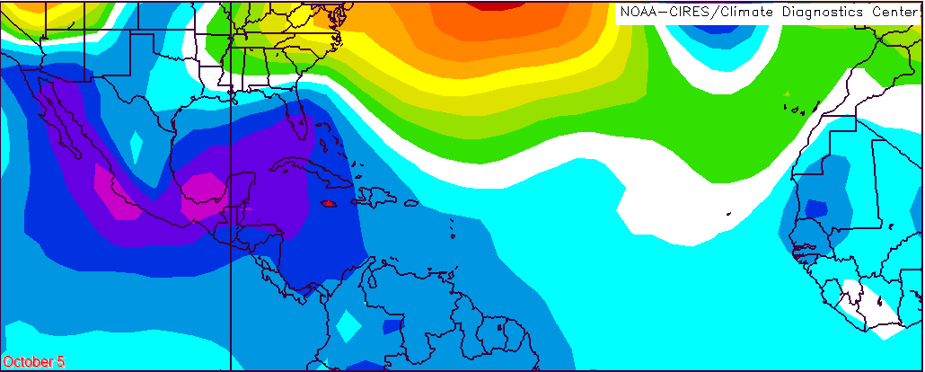 The animation below displays the mean sea level barometric pressure (in millibars) for the period October 5 through October 15, 2005 and shows the development of the surface low pressure system that would become Hurricane Wilma three days later. The center of this area is identified by a red asterisk.