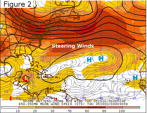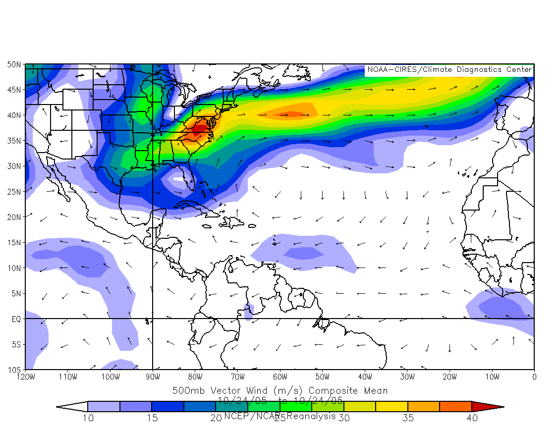 Conditions at the 500mb level, located at approximately half-way point of our atmosphere, often serve as an indicator of the average condition of an air column. Using this fact, meteorologists frequently use wind speed and direction at this level to determine the mean steering winds of a hurricane. The charts of mean 500mb vector wind for October 19 (Figure 3) and October 20 (Figure 4) show that Wilma's steering winds were from a northerly direction and less than 10 meters per second as it slowly drifted towards the Yucatan Peninsula.