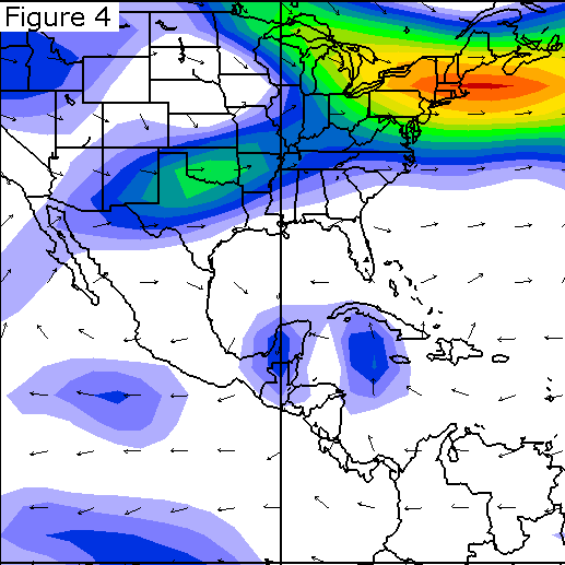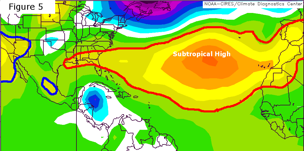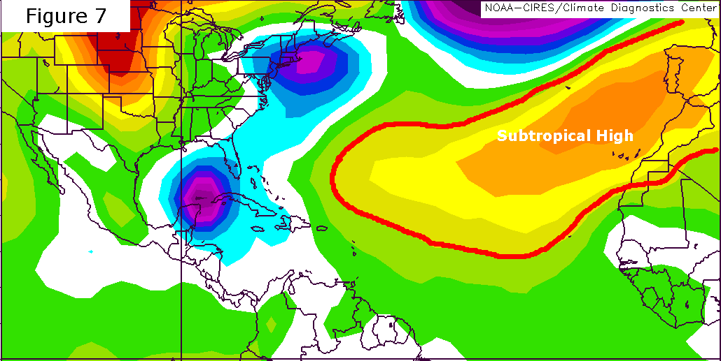 By October 23rd (Figure 7), the Atlantic subtropical high had retreated significantly from its previous configuration on October 19 (Figure 5), allowing Wilma to assume a northeastward track. This tendency of hurricanes to assume a northeasterly track is referred to as recurvature.