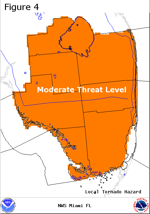As Wilma approached Florida in the early hours of October 24, 2005, the Miami office of the NWS published the tornado threat graphic (Figure 4) and listed the threat level as moderate. In the context of this graphic, moderate threat means "a 16% to 25% probability of minor tornado damage (damage consistent with that caused by F0 tornadoes." An F0 tornado, as coded by the Fujita Tornado Scale, would result in damage to chimneys, a few downed trees and power lines, and damage to lighter-weight outbuildings.